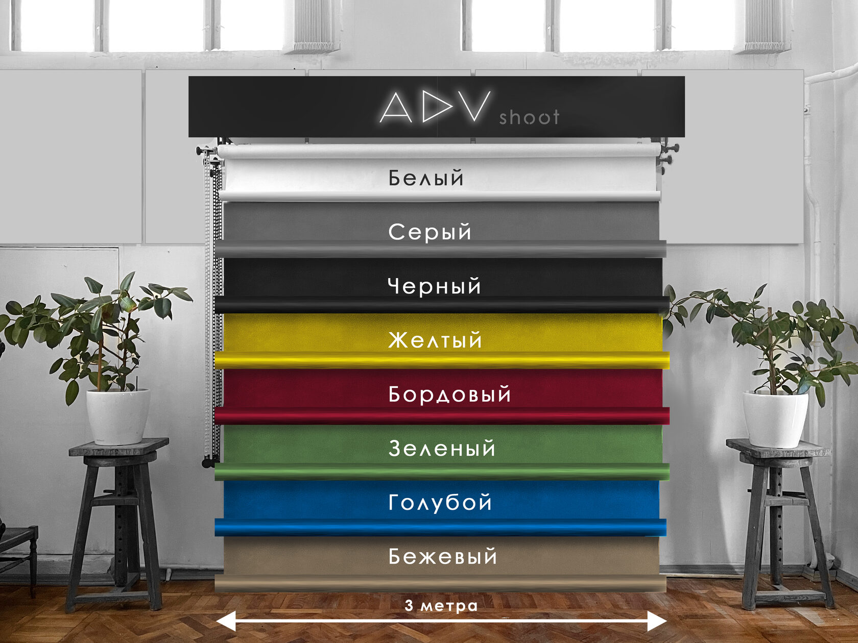 • Белый, Черный, Серый, Красный, Бежевый, Жёлтый, Голубой, Хромакей (зеленый).