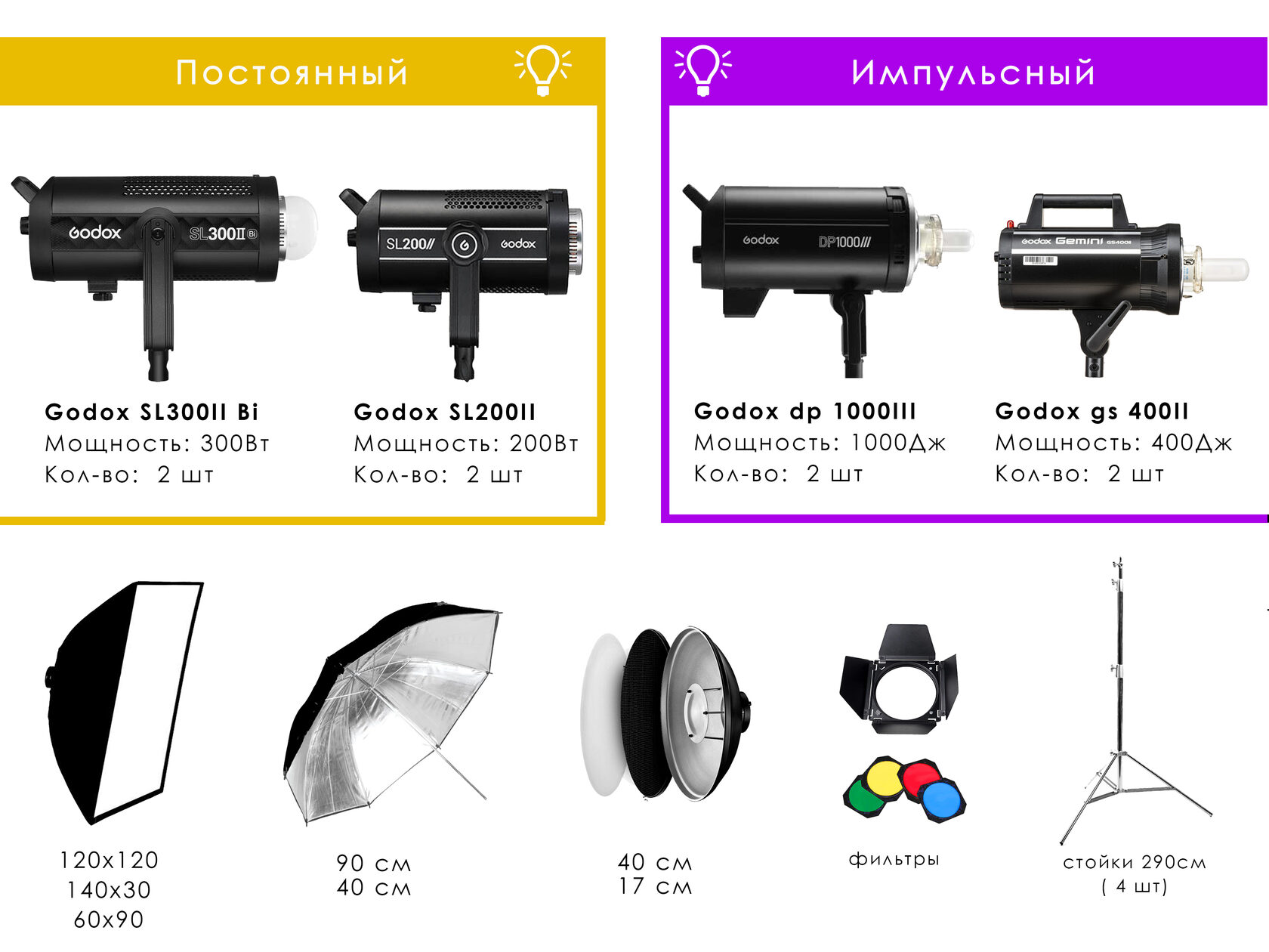 • Софтбоксы - 30х140, 35х160, 120х120, 60х90.